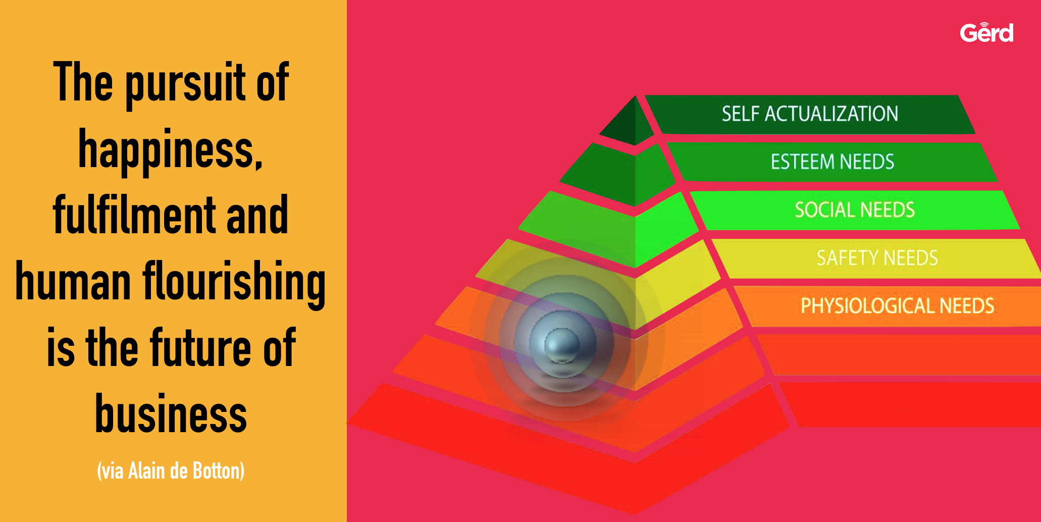 Remaining relevant, unique, purposeful, and indispensable in the future is obviously a key objective for every business (and every professional) everywhere, yet technology will no doubt continue to generate exponential waves of disruptions at an ever-faster pace. Soon – once technology has made almost everything efficient and abundant (just look at Spotify and the music business to see how that works) – I believe that we will need to focus on the truly human values of business, i.e. to humanise or better yet transcend technology and to move up Maslow’s needs pyramid, as people and as businesses. Successful business will no longer be about running a well-oiled machine or about great products at fantastic prices; rather it will be about uniquely furthering human flourishing. After all, the purpose of life is the pursuit of happiness (as the ancient Greeks keep telling us, see philosopher Alain de Botton’s great talk about this very topic)