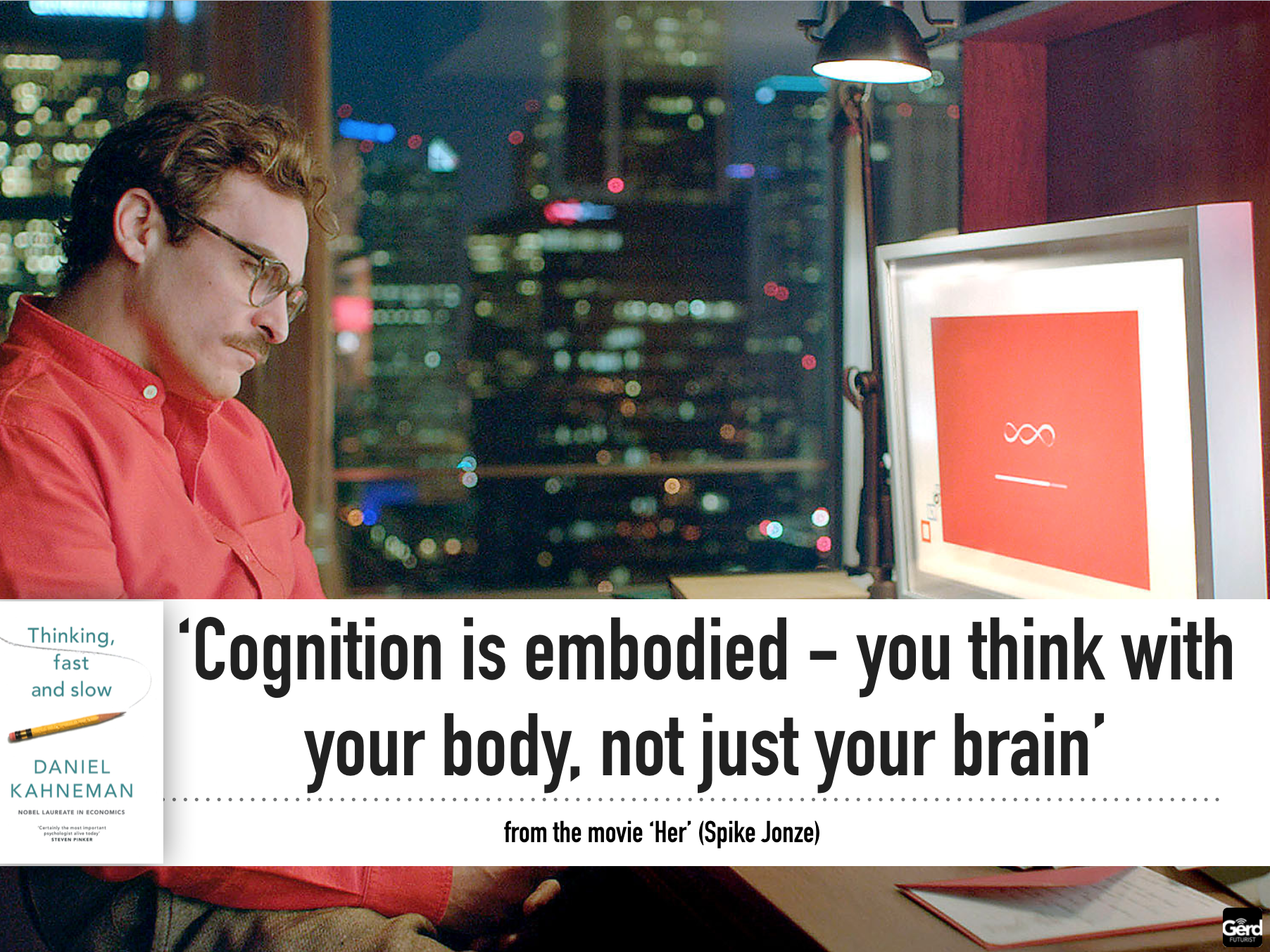 We now have to face the distinct possibility that as machines become infinitely more capable of doing what we used to do, particularly with our more mathematical or logical ‘left brain’ capabilities (to use a rather outdated term), we will probably need to becomemore human and increasingly less like machines, in order to remain valuable. Ironically, this is completely the opposite of what a lot of traditional education schemes (such as MBAs?) entailed e.g. avoiding emotions, limiting imagination, and sticking to schedules and plans. If you believe (as I do) that non-algorithmic i.e. emotional, (sub)conscious or even holistic and kind of spiritual factors such as trust, purpose, ethics, and values are and will remain at the core of human societies in the foreseeable future, this will clearly put a much stronger emphasis on truly human cognition, i.e. what Daniel Kahnemann means when he says that ‘cognition is embodied – we think with our bodies not our brains’ . Education, training and learning will be changed forever as a consequence. And what if – in the near future – many routine business activities or operations are actually handled by algorithms and intelligent agents acting on our behalf? In sectors such as procurement, logistics, or telecommunications network management it may very well be possible to have intelligent, self-learning software, and reasoning robots take care of 50-90 percent of the frequent and repetitive tasks, within a decade from today. This would obviously lead to huge increases in efficiency and potentially massive costs savings, bringing much lower prices for consumers but would also bring a crushing commoditization for those companies (and people) that currently provide these services. Clearly, human operators cannot and should not compete here – the only way for us is to move up the food-chain, i.e. to do the work above the API(application program interface).