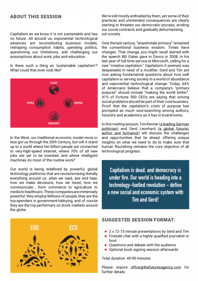 Tim Renner and me have cooked up a cool new offer for clients who want something different than the usual keynotes: Tim and me will present for 15 minutes each, followed by a moderated discussion with live audience interaction. Check out the PDF! More about Tim and Gerd here and here. Capitalism as we know […]